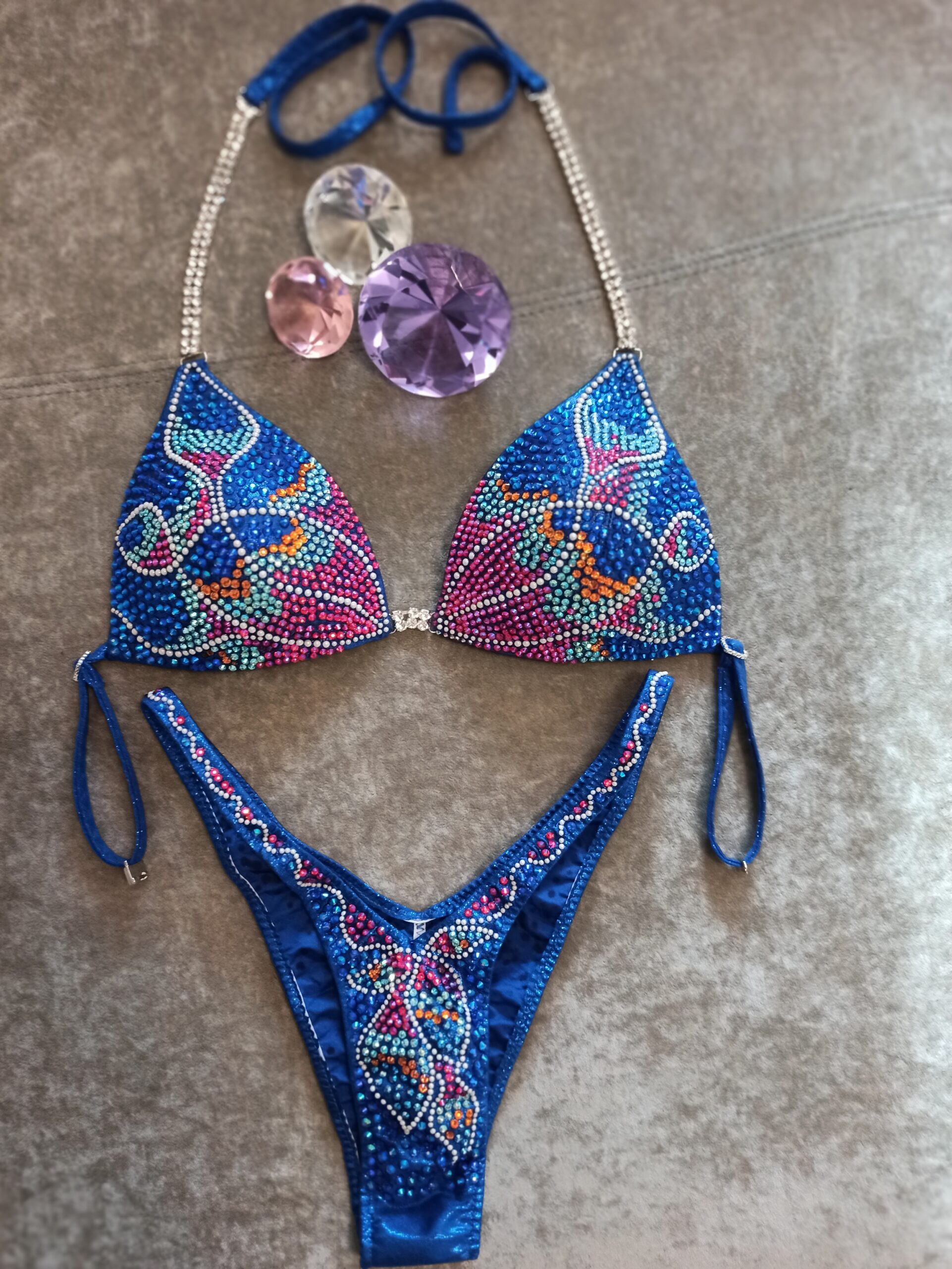 Bikini lycra bluette, coppe triangolo push up, slip alla russa back a brasiliana regolamentare. Decorazione con contorni in perle bianche, Swarovski fuxia ab, turche si, blu ab, e oro, molto luminoso. Disponibile su richiesta in tutte le taglie, anche differenziate tra sopra e sotto.