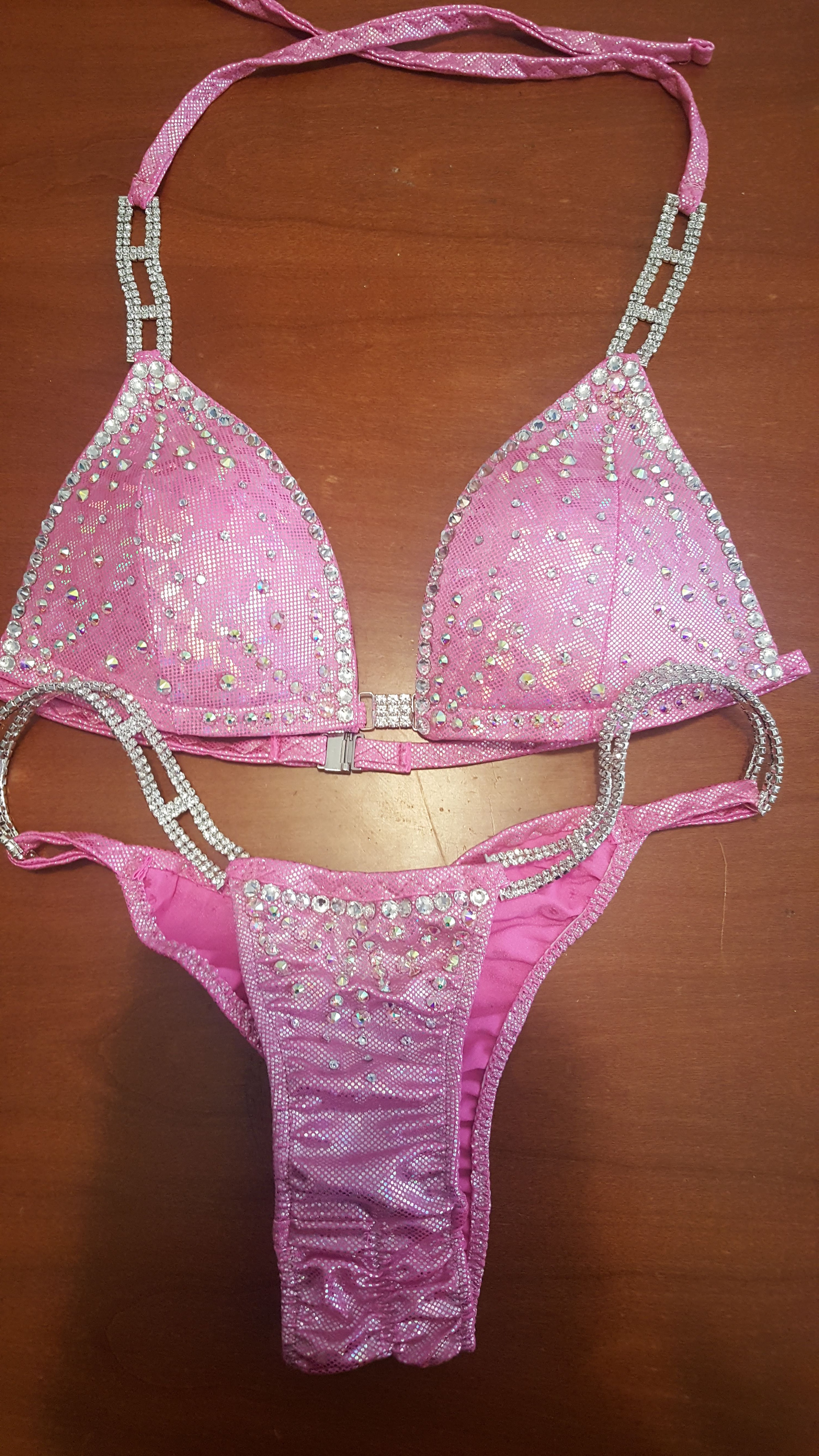 bikini mod proligue su base glitter rosa. Decorazione media con swarovski cristal. Triangolo con coppe a push up. Slip con back arricciato a cuore per esaltare il gluteo. 5 connettori.Disponibile in tg differenziate.